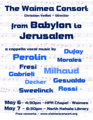 From the rivers of Babylon to the Temple of Jerusalem, from the fallen Babylon to the New Jerusalem, both cities have inspired amazing choral pieces from the early days of polyphony to the present times. For its Spring 2012 program, the Consort will bring to the Island of Hawaii works mostly written by composers from the medieval and renaissance era, with Dufay, Gabrieli, Gesualdo, or Morales for pieces on Jerusalem. Babylon will be highlighted by Psalm 137, set in French by Goudimel and Sweelinck, and in its original text (Hebrew) by the Italian Jewish composer Salamone Rossi. "Les deux Cités" (The Two Cities) by XXth century French composer Darius Milhaud will bring Babylon and Jerusalem in a stunning choral triptych, full of challenging sounds and complex voicing. A couple of surprises from the early days of polyphony and the beginning of the 21st century will be added to this exciting program: a unique opportunity to hear live rarely sung jewels of the a cappella repertoire.